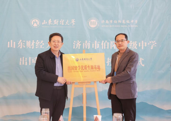 徐明春代表学院向济南市伯阳高级中学授予“山东财经大学出国留学优质生源基地”牌匾。济南市伯阳高级中学校长张良接牌。
